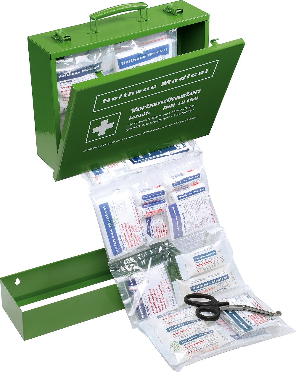 Verbandkasten aus lackiertem Stahlblech mit Gummidichtung.