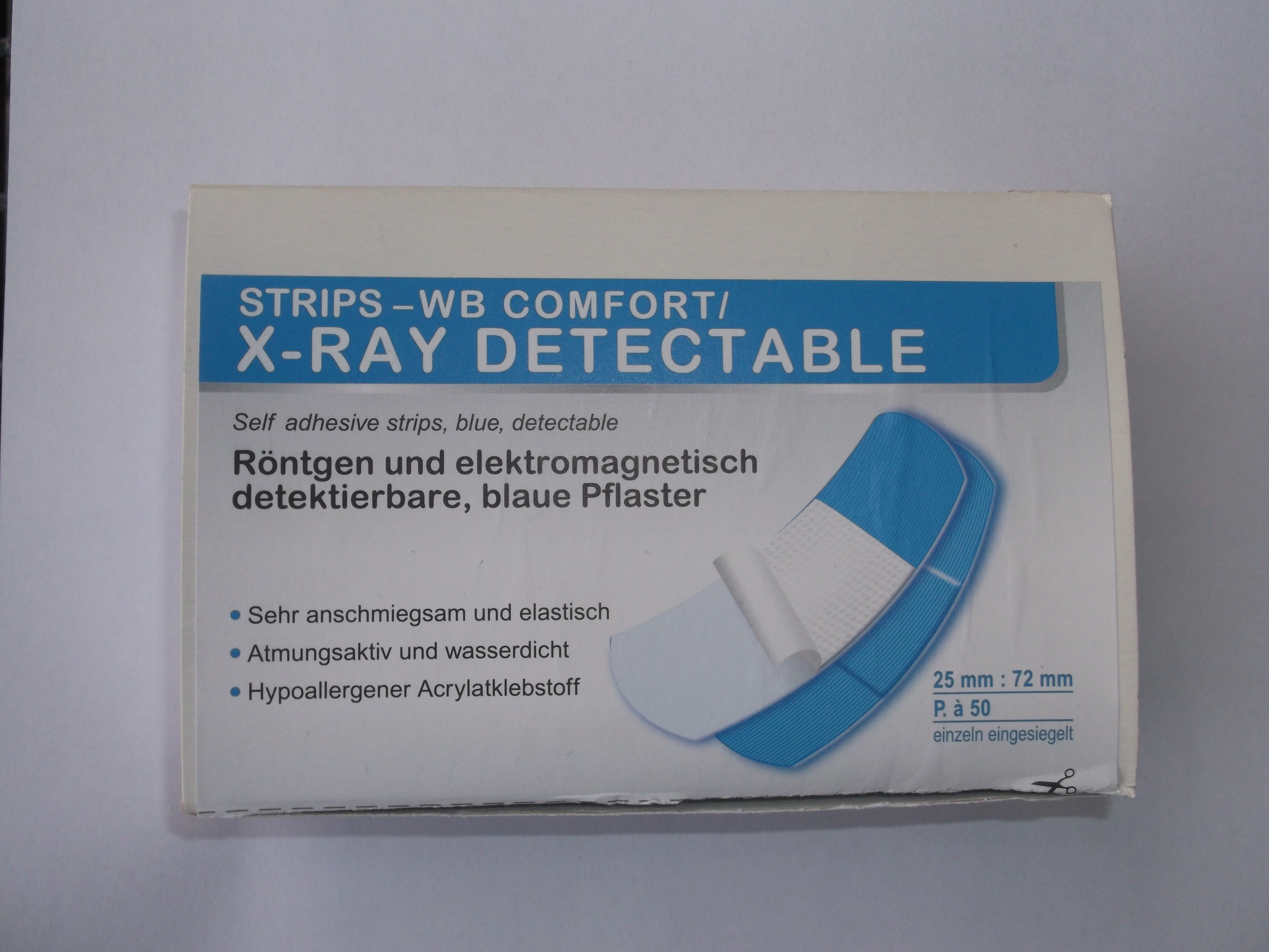 Pflasterstrips WB Comfort/X-RAY, elastisch + wasserfest, blau, röntgen- und elektromagnetisch detektierbar, bakteriendicht, atmungsaktiv, 2,5x7,2cm, zur Abdeckung von Hautverletzungen. Packung mit 50 Stück (einzeln in Papier eingesiegelt).