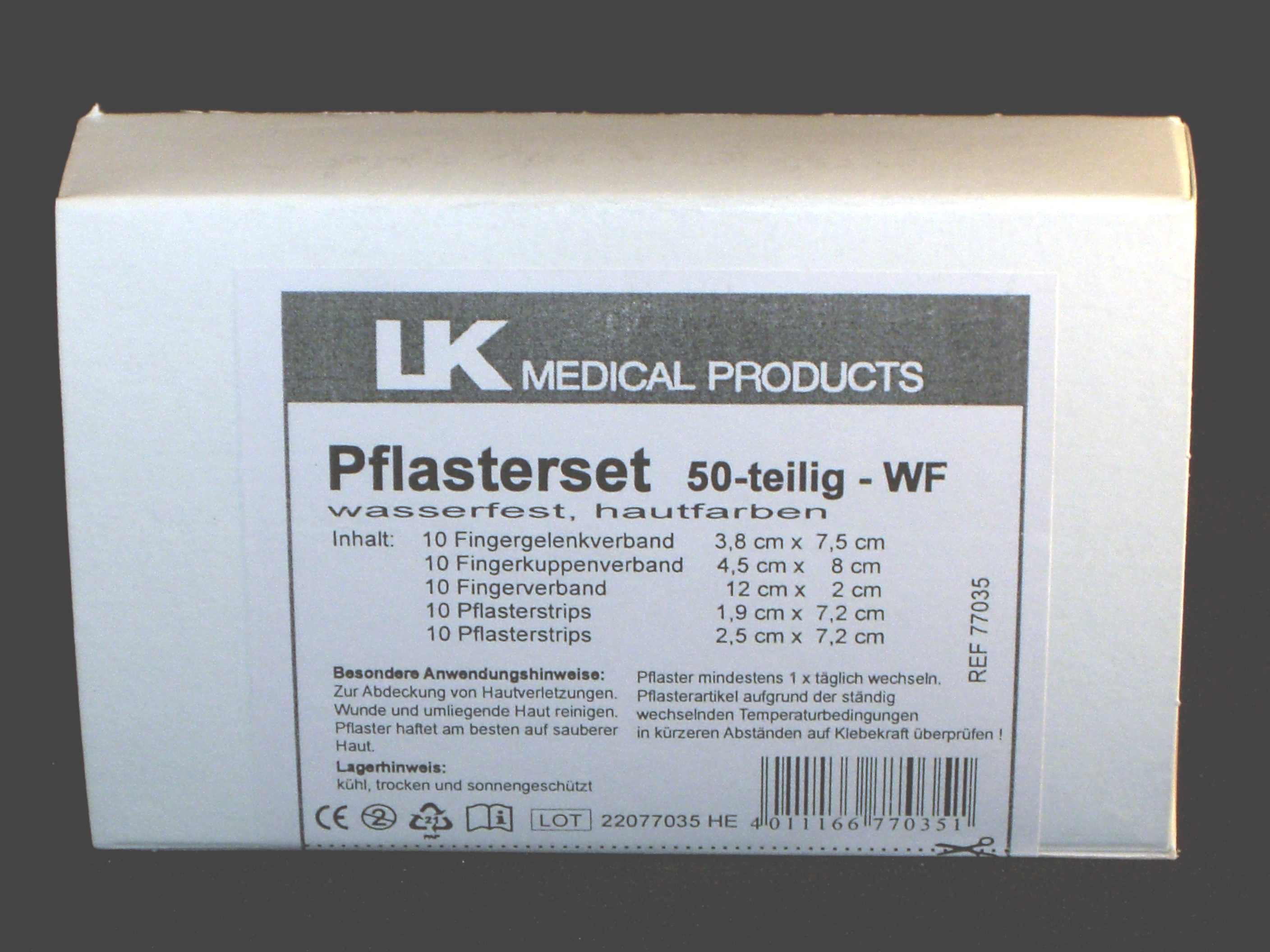 Inhalt bestehend aus: 10 x Fingergelenkverbände 3,8x7,5cm, 10 x Fingerverbände 12x2cm, 10 x Fingerkuppenverbände 4,5x8cm,